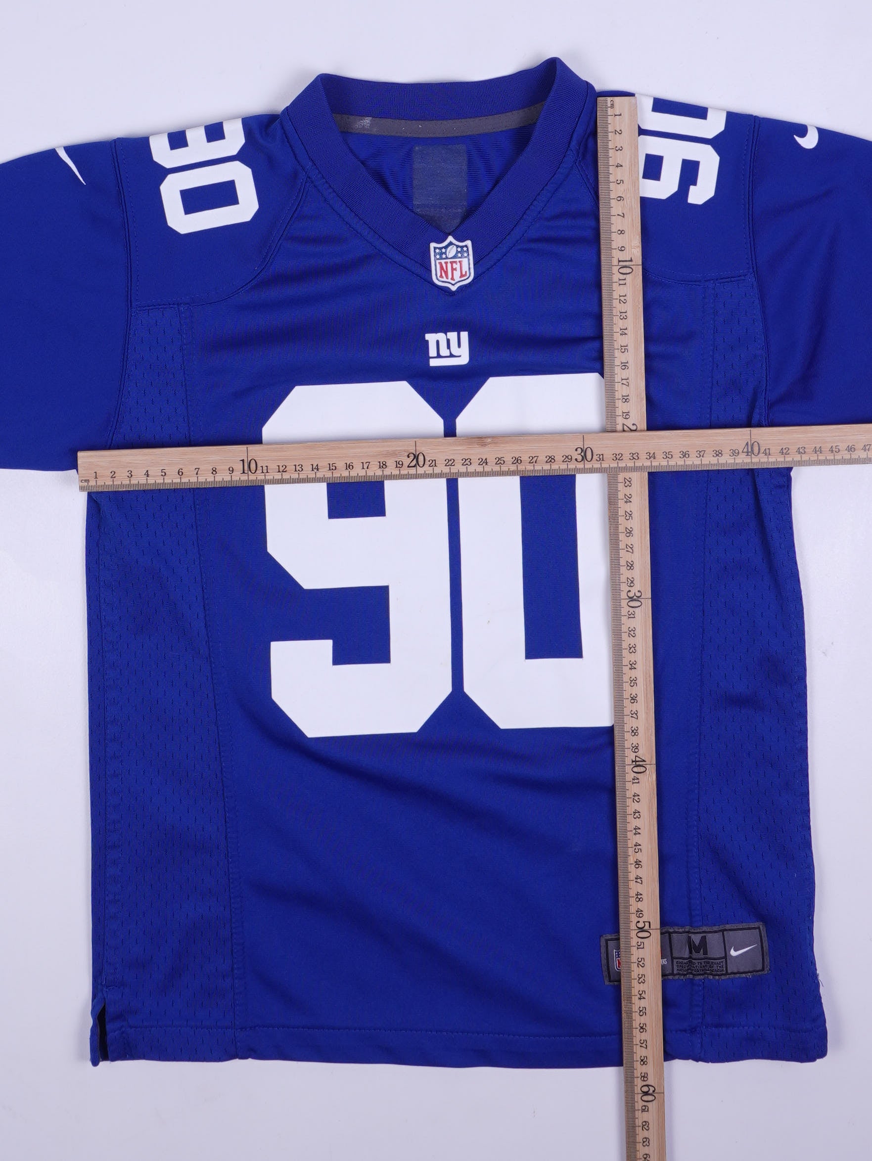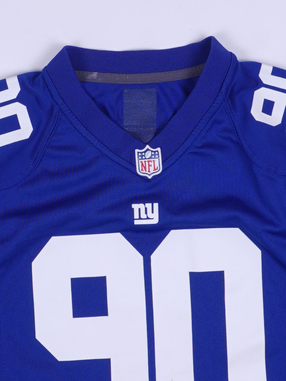 Details: NFL New York Giants Jersey in Königsblau mit weißer Spielernummer 90 (Front/Schultern/Back) und Namensprint „PIERRE-PAUL“ am Rücken; V-Ausschnitt mit NFL Shield am Kragen und kleinem „ny“-Logo auf der Brust; Nike Swoosh am Ärmel; leichte Poly-Mesh/Performance-Optik mit seitlichen Mesh-Einsätzen; gewebtes Nike/NFL Team Apparel Size-Patch unten (Größe M).