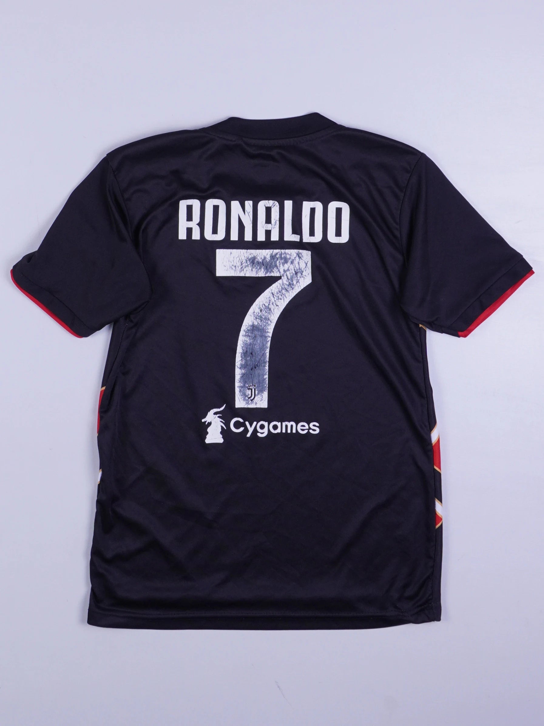 Details: Fußballtrikot mit mehrfarbigem grafischen Muster, 'Juventus'-abzeichen, Markenlogo und Spielername und Nummer auf der Rückseite.