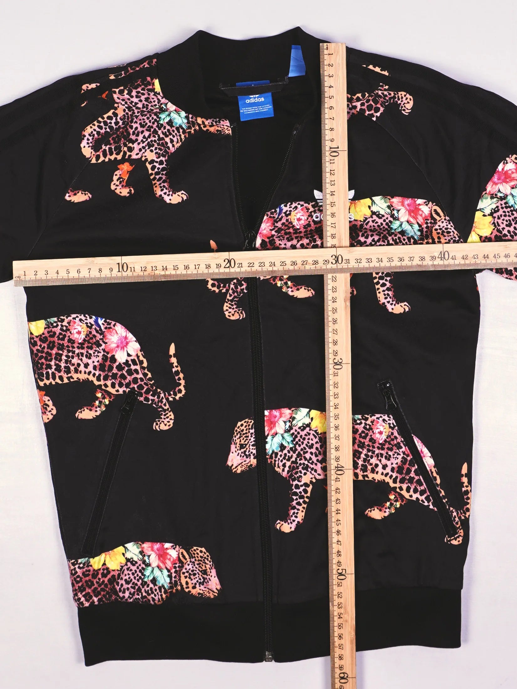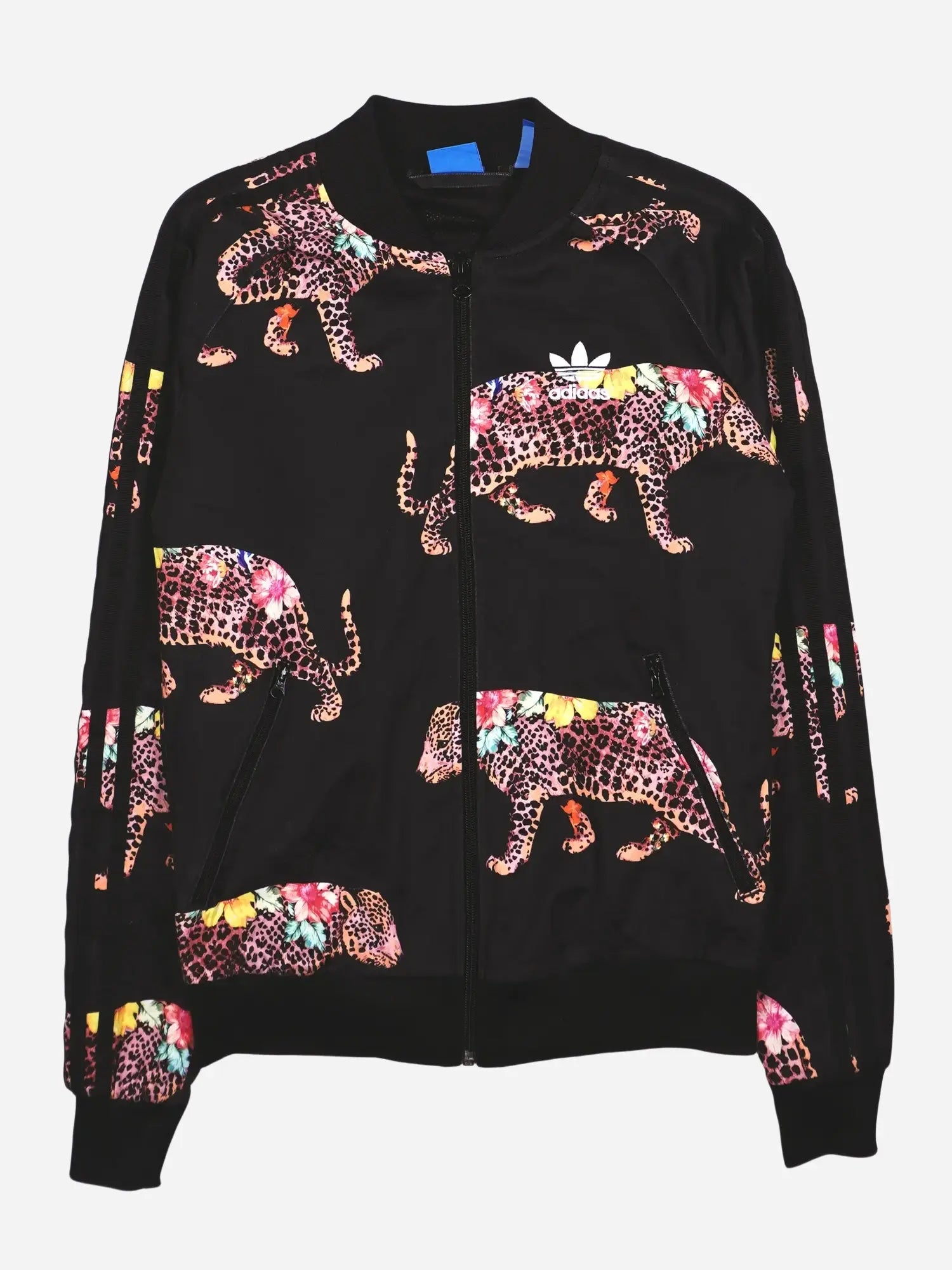 Details: Allover-Leoparden- und Blumen-Print, großes und kleines Adidas-Trefoil-Logo als Print, Rippbündchen, Raglanärmel, durchgehender Frontreißverschluss, Seitentaschen mit Zipper.