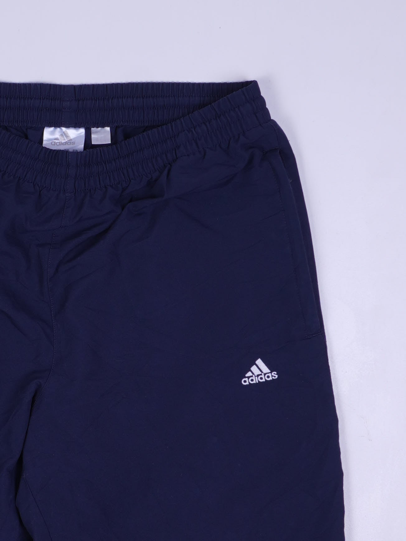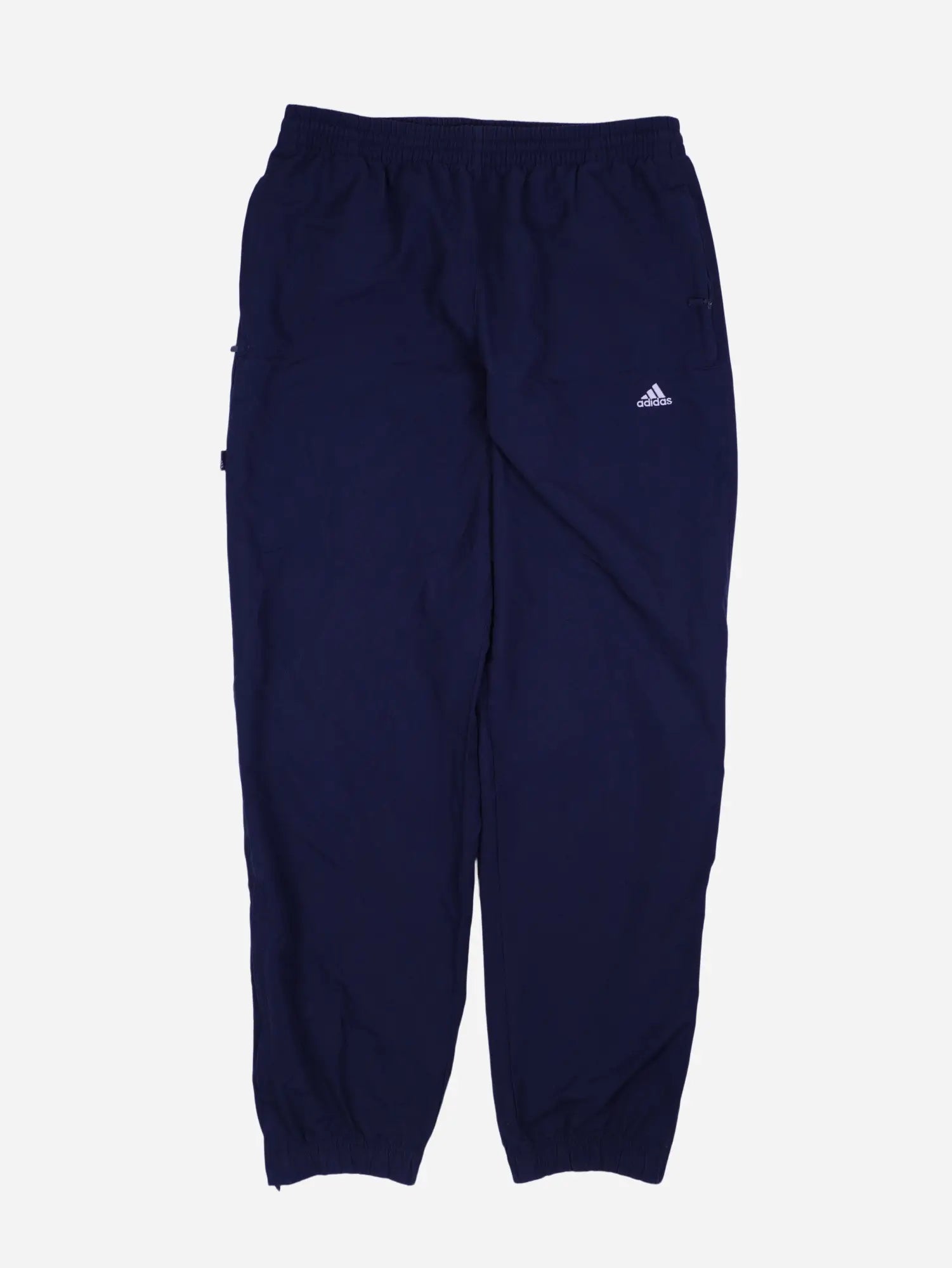 Details: Leichte Trainingshose aus glattem Synthetikstoff in Marineblau mit elastischem Bund, seitlichen Taschen, kleinem weißen Adidas-Logo auf dem Bein und elastischen Beinabschlüssen.