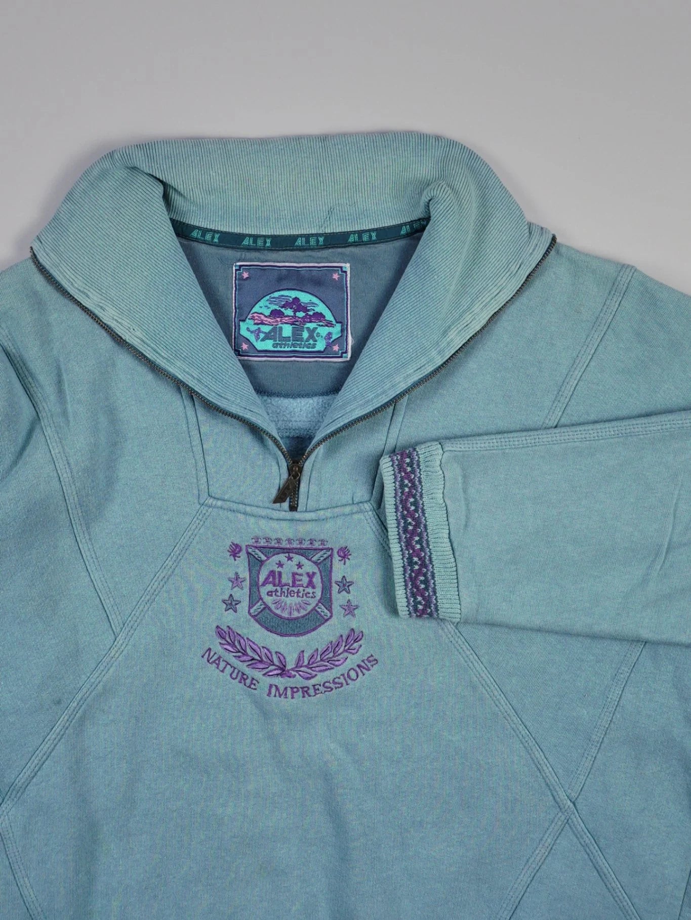 Details: Hochkragen mit halbem Reißverschluss, lila Stickerei auf der Brust, dekorative Bündchen