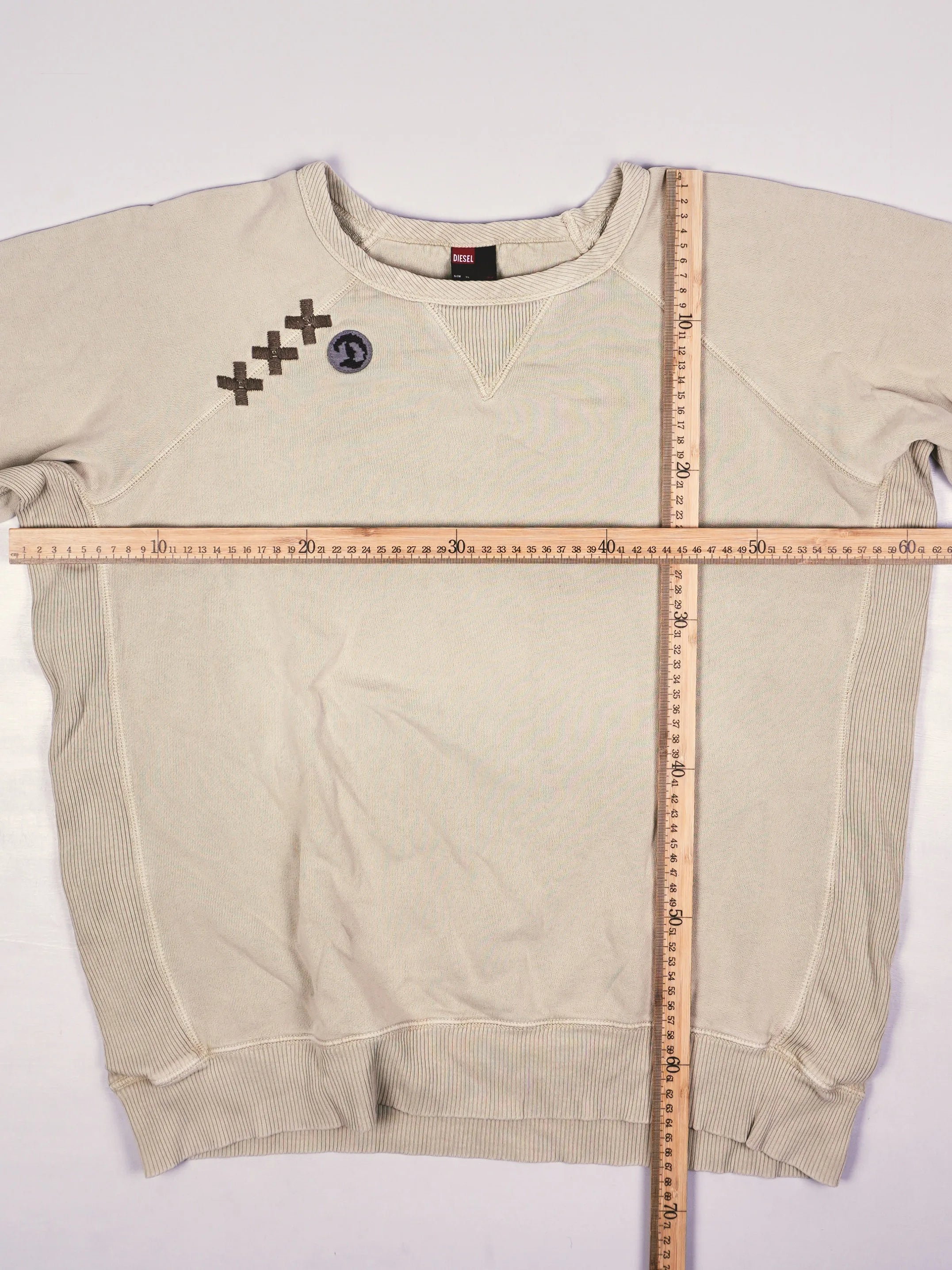 Details: Beiger Sweatstoff, Raglanärmel, gestickte XXX-Details und Diesel-Logo über der linken Brust, breite Rippbündchen, Vintage-Worn-Look.