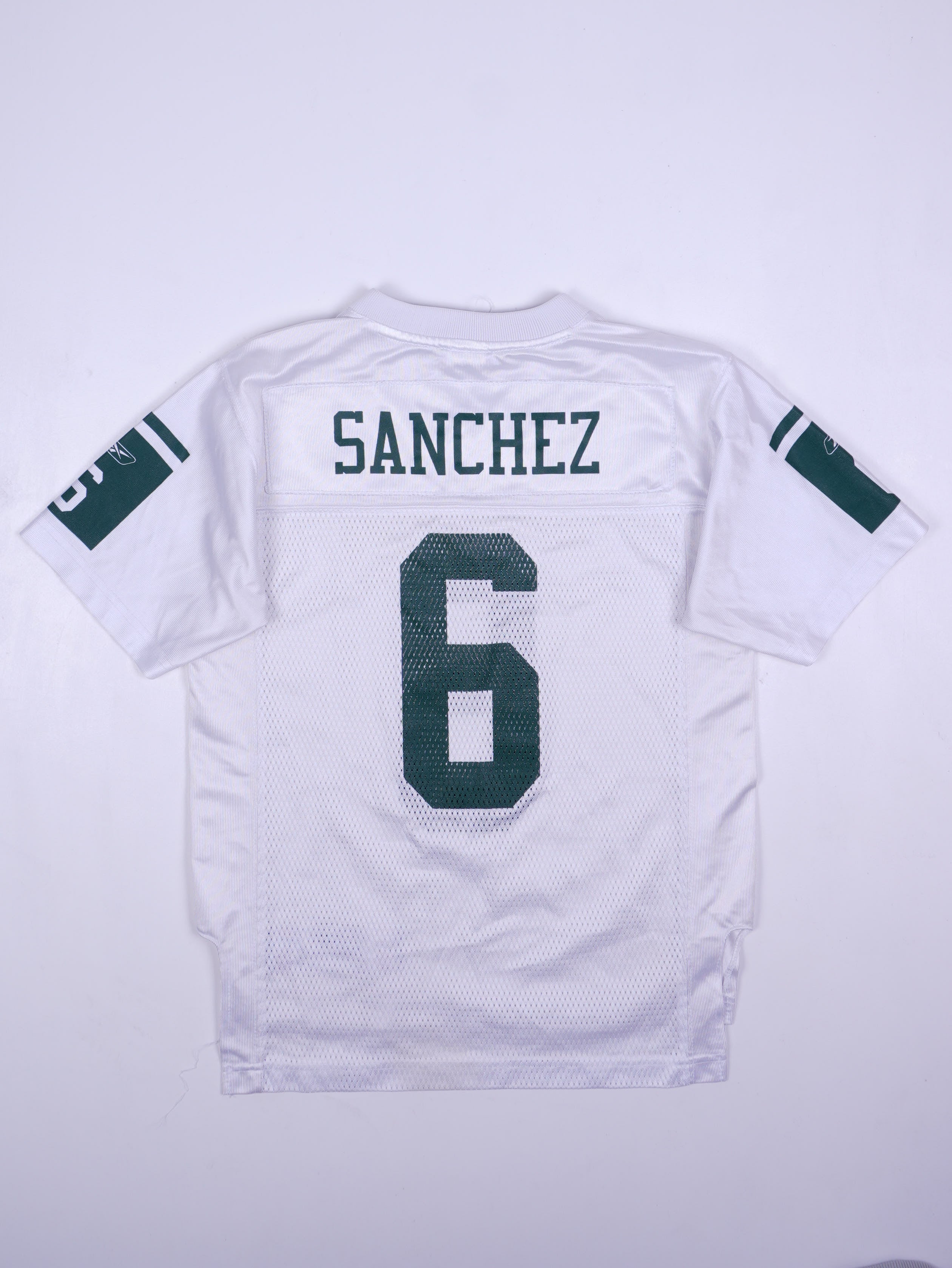 Details: NFL Equipment Reebok Replica-Jersey der New York Jets in Weiß mit grünen Details; atmungsaktiver Mesh-Körper, V-Ausschnitt mit gesticktem NFL-Shield, Jets-Oval-Logo als Brustpatch, Ärmelstreifen/Applikationen; großer Rückenname „SANCHEZ“ und Nummer 6 vorne & hinten (gedruckt/heat-pressed). Größe laut Neck-Tag: Youth M (10–12).