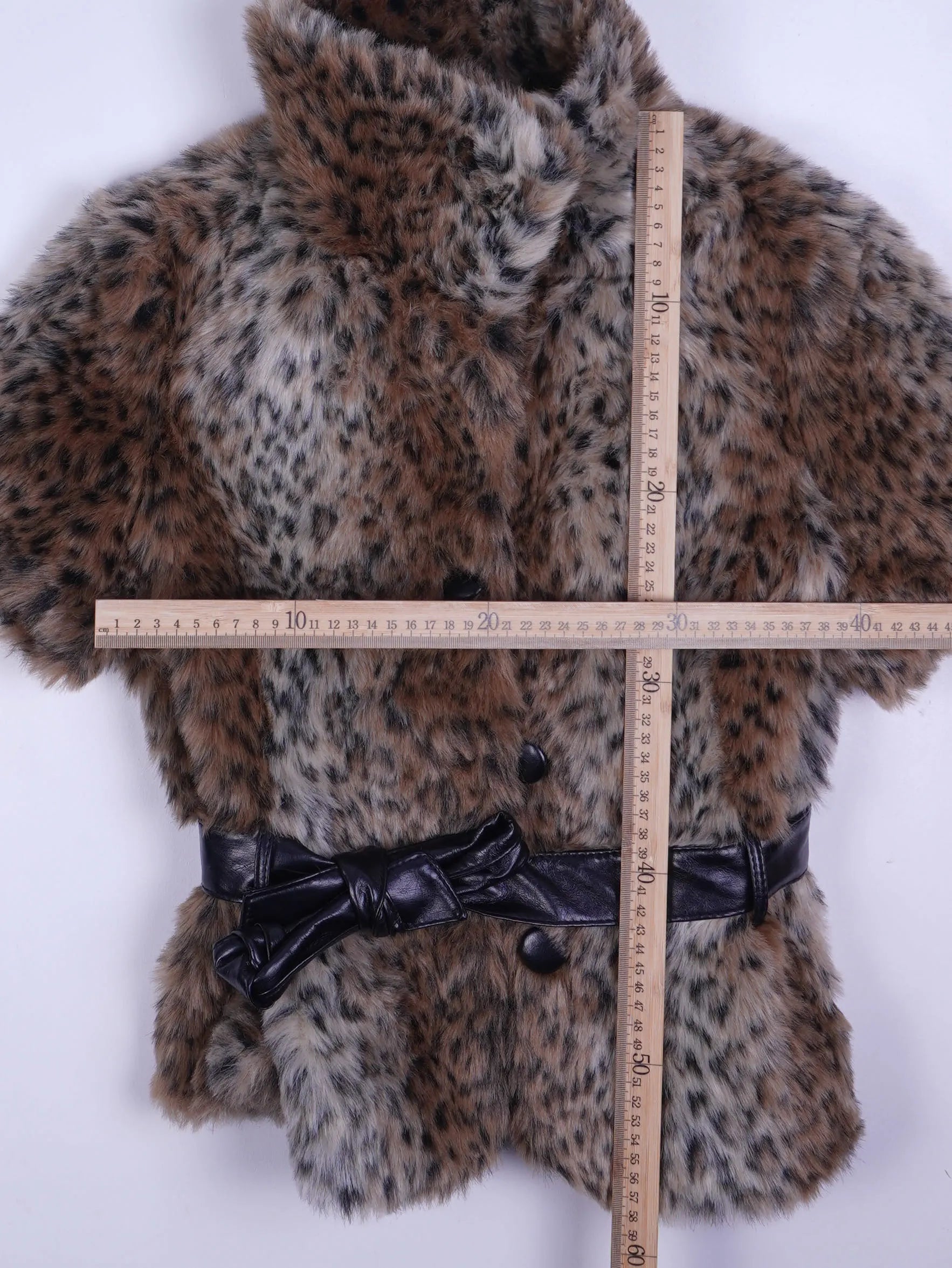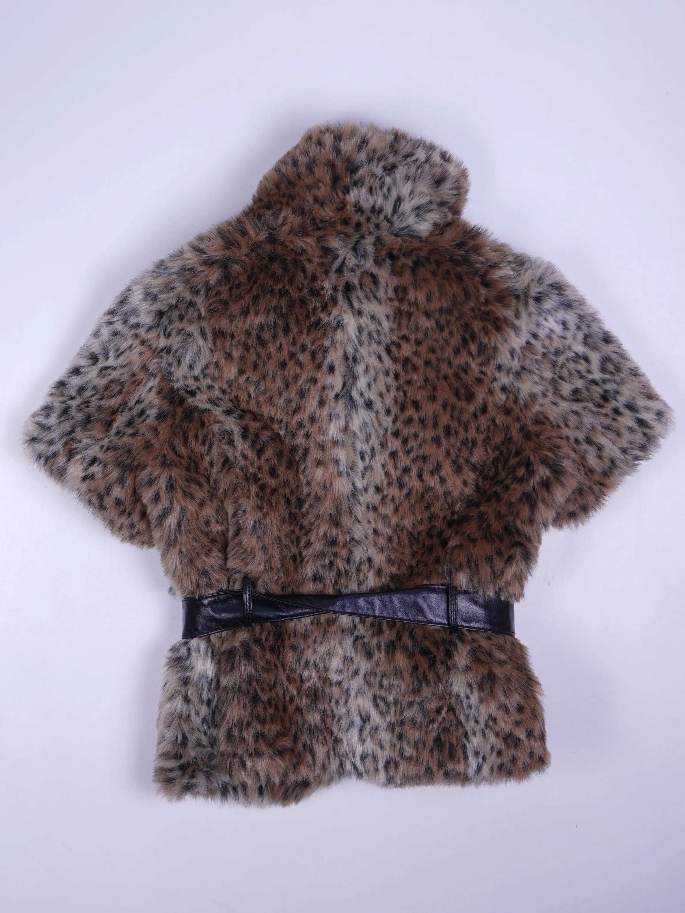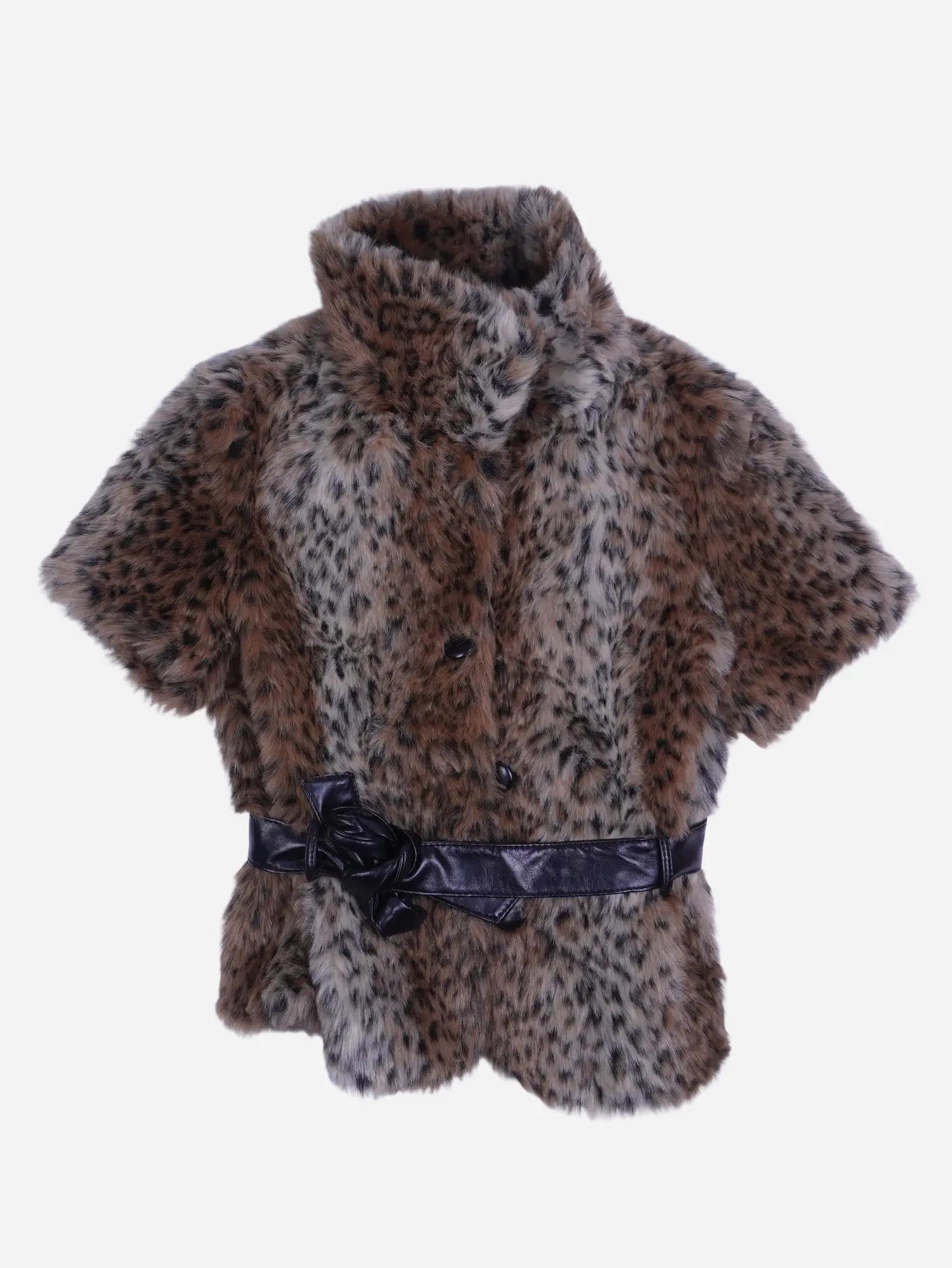 Details: Kurzärmlige Fake-Fur-Jacke mit mehrfarbigem Leo-/Fleckmuster (braun, beige, grau), einreihige Knopfleiste, breiter Reverskragen, schwarzer Kunstleder-Gürtel mit Schleifen-Detail an der Taille, innen gefüttert, kurze Länge bis ca. Hüfte.