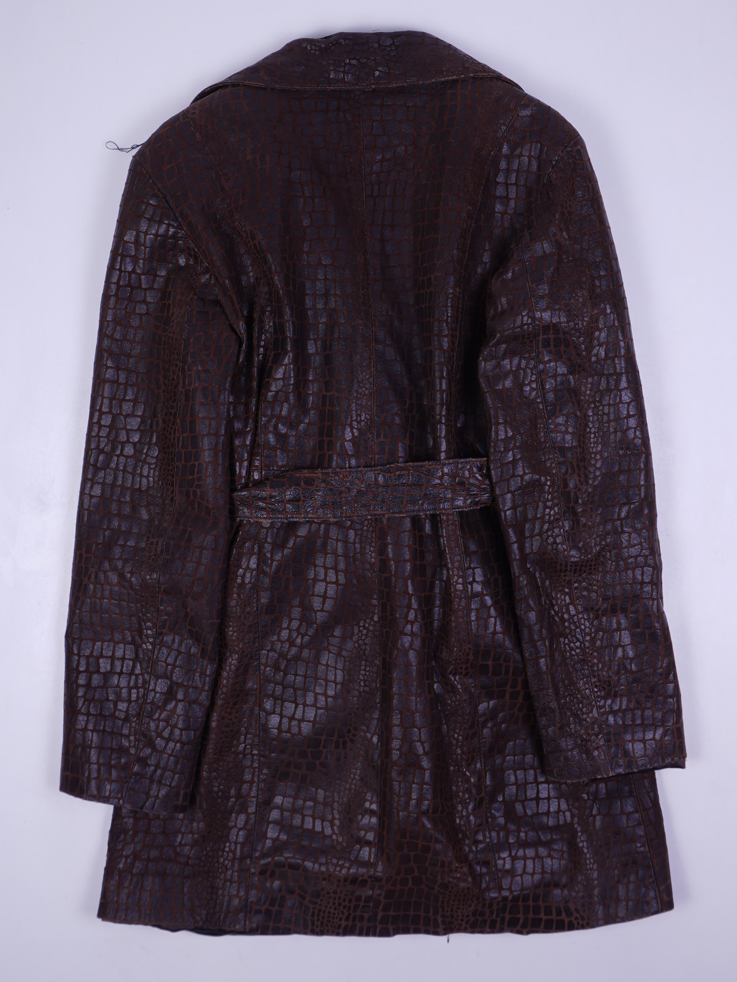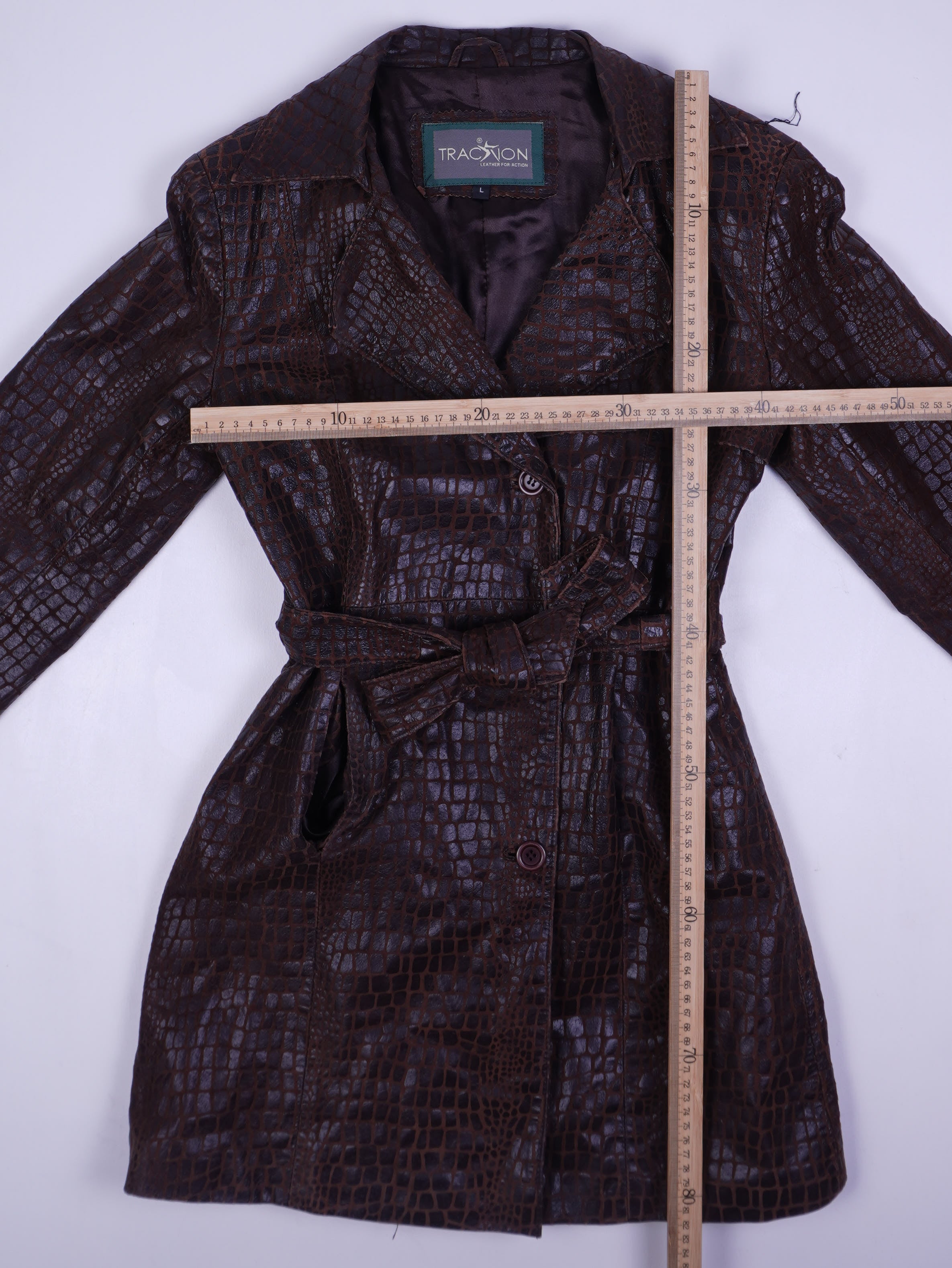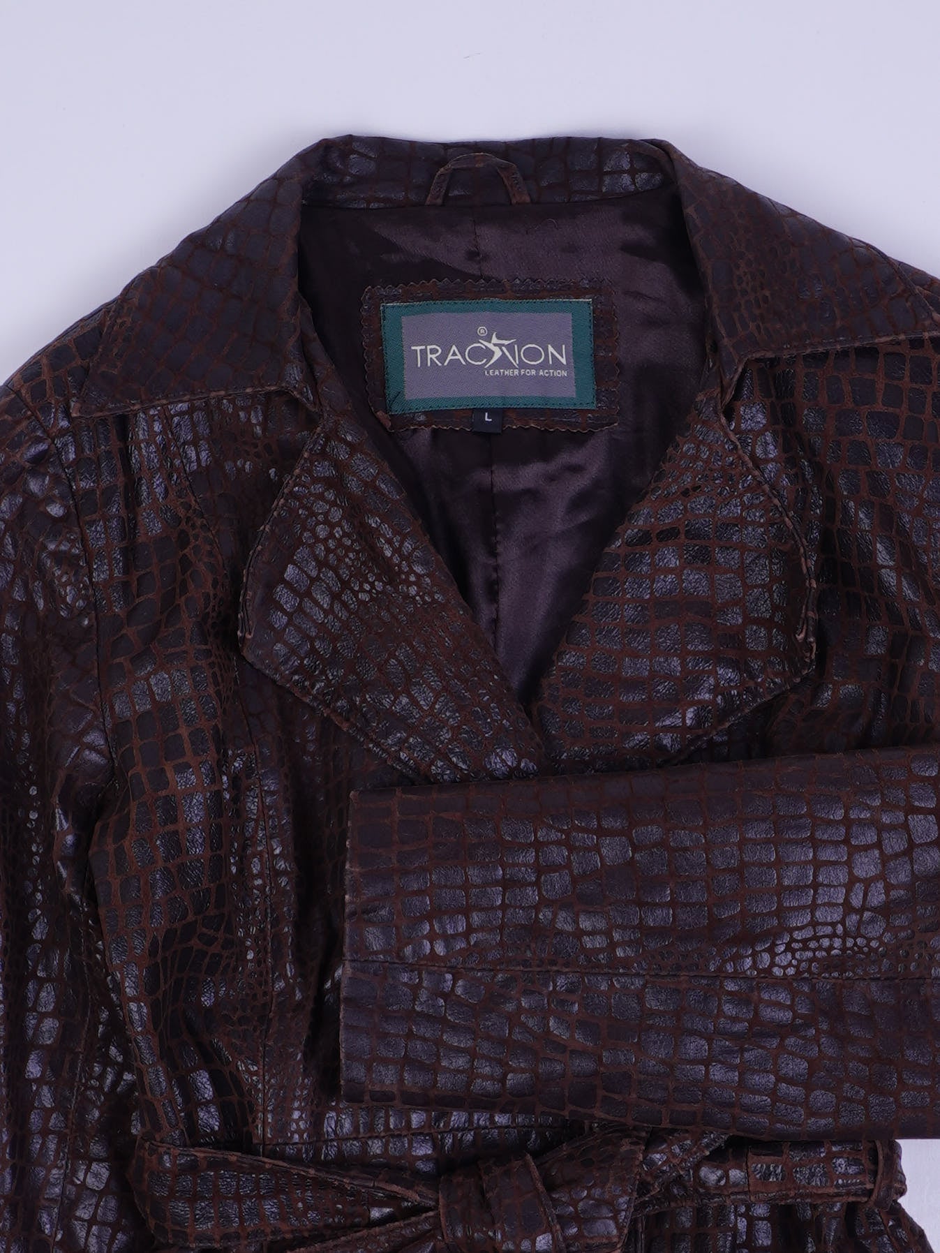 Details: Dunkelbrauner Leder-Mantel/Trenchcoat im geprägten Kroko-Reptil-Look mit leichtem Glanzfinish. Klassischer Reverskragen, zweireihig wirkende Überlappung mit Knopfverschluss (sichtbare Knöpfe), Taillengürtel zum Binden (self-belt) und seitliche Eingrifftaschen. Innen vollständig gefüttert (satiniertes Futter). Label: „TRACTION – LEATHER FOR ACTION“, Größe L.