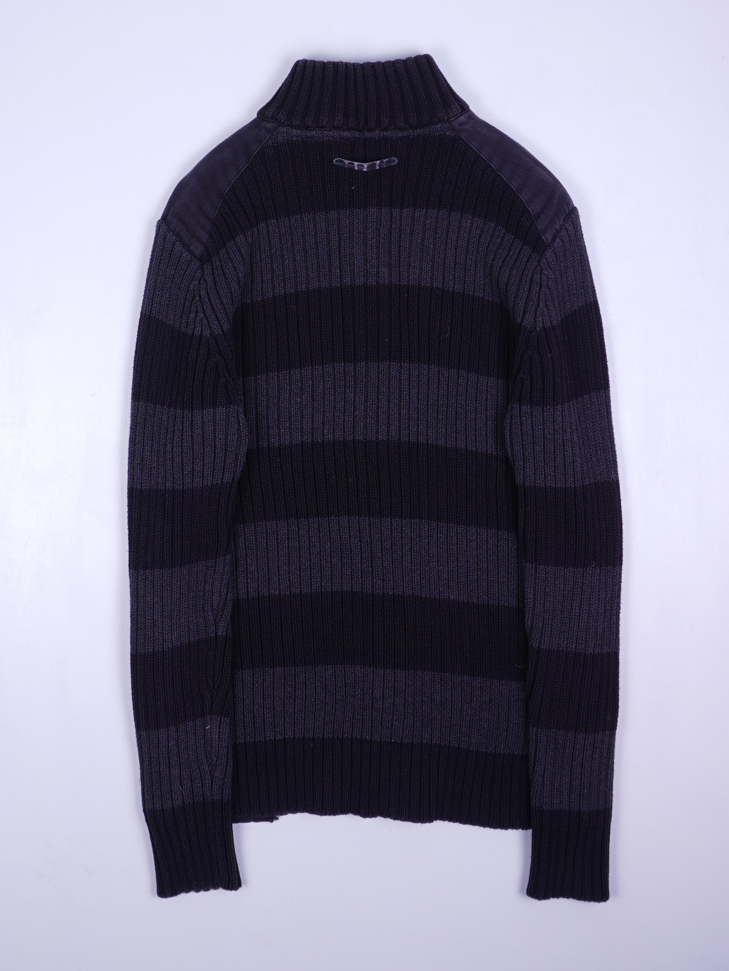 Details: Gerippte Strickjacke mit durchgehendem Front-Reißverschluss und hohem Stehkragen (Rippbund). Breite horizontale Streifen in Dunkelblau/Anthrazit, vollflächige Rippenstruktur. Schulterpasse aus velours-/suedeartigem Material (dunkel), kleines Teddy-Smith-Label innen am Kragen (Größe M). Unten rechts aufgenähter runder Patch mit „1989“-Motiv; kleiner dekorativer Steg/Tab am oberen Rücken.
