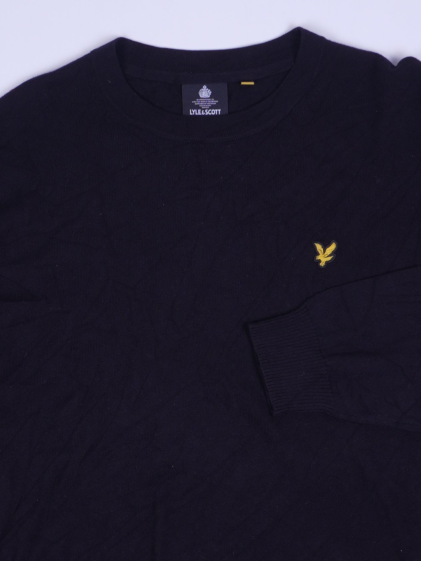 Details: Schlichter Crewneck-Sweater in Schwarz mit geripptem Rundhalsausschnitt, Bündchen und Saum. Links auf der Brust kleines gesticktes gelbes Adler-Logo. Weblabel am Nacken mit Schriftzug „LYLE & SCOTT“; glattes, fein gestricktes/strukturiertes Material ohne Print, klassischer Regular-Fit.