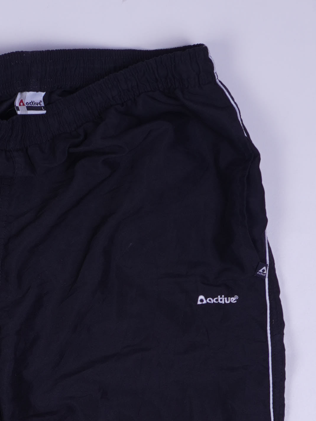 Details: Leichte Nylon-Trackpants mit elastischem Bund, weißer seitlicher Paspelierung, kleinem 'active'-Logo vorne und Kordelzug am Saum.