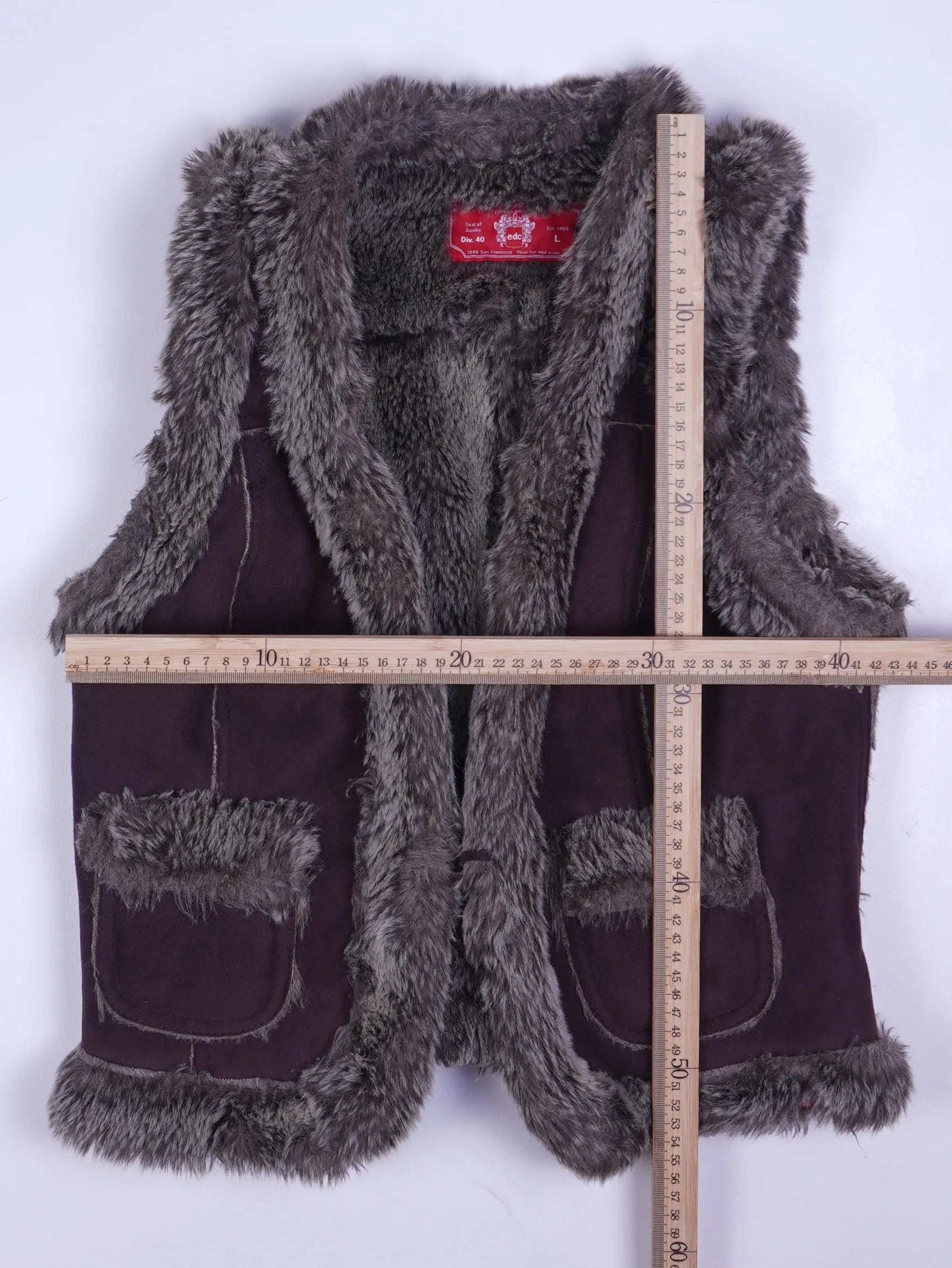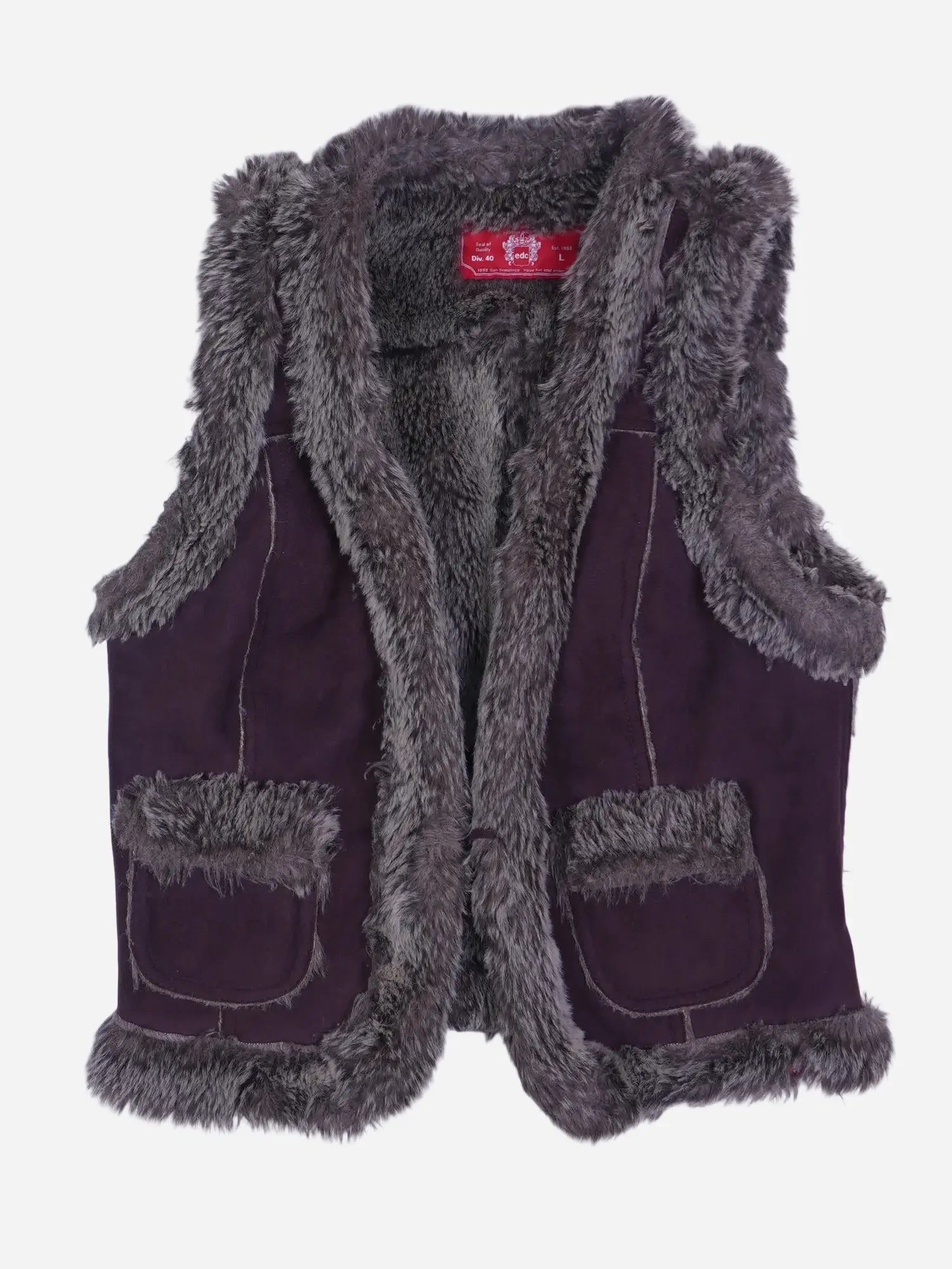 Details: Ärmellose Weste mit kompletter Fell-Innenseite, breiter Fellkante an Armloch, Vorderkante und Saum; zwei aufgesetzte Taschen mit Fellbesatz vorne; sichtbare Teilungsnähte; Labelpatch/Necklabel „edc by Esprit“, Größe L, Div. 40; weiche Wildlederoptik außen, Kunstfell in mittelgrau.