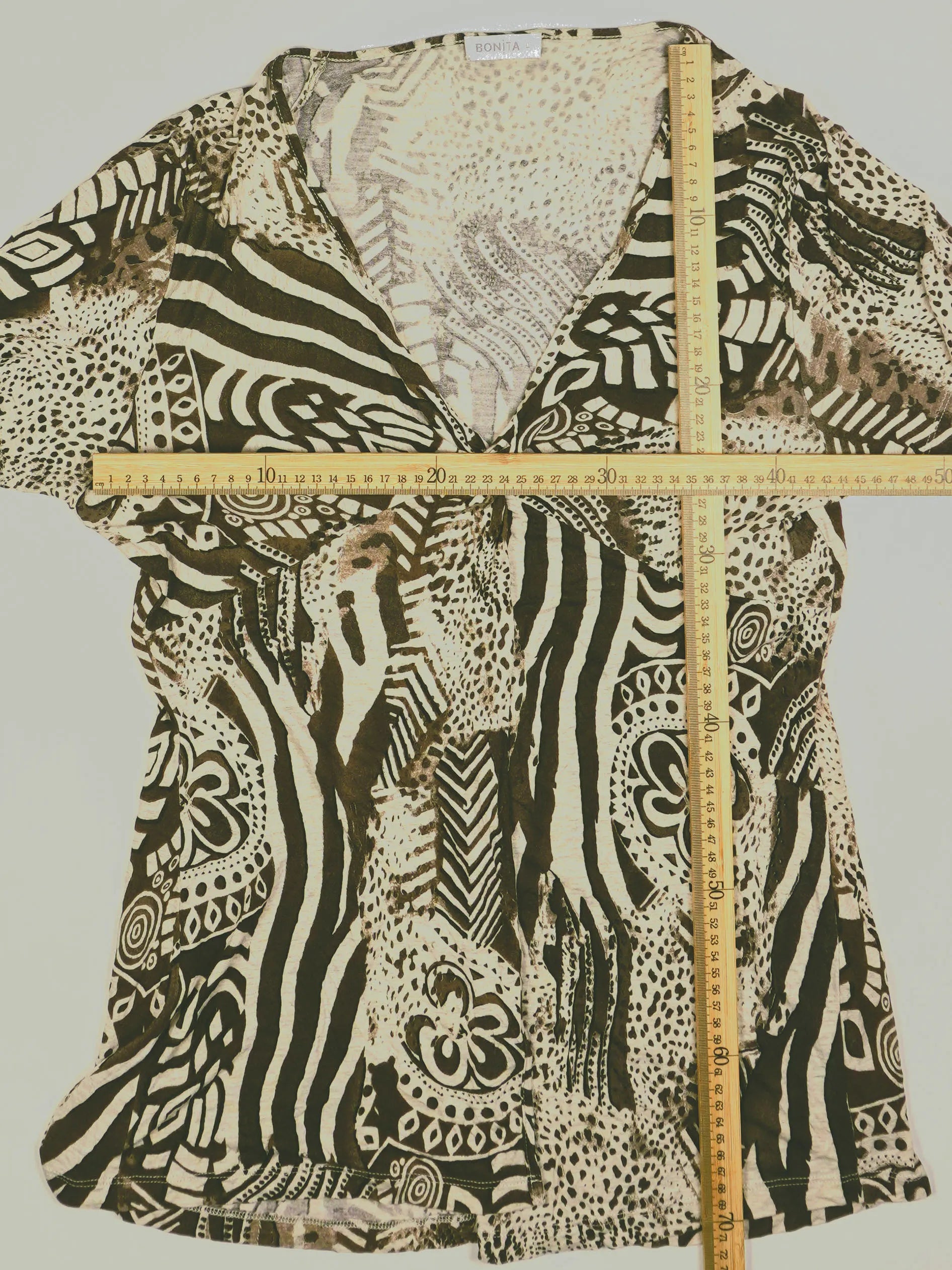 Details: Kurzarm-Top mit tiefem V-Ausschnitt, vordere Raffung/Knoten unterhalb der Brust, allover Animal-/Ethno-Print in Beige, Braun und Schwarz, leicht ausgestellte Saumweite, weicher leichter Jersey-Stoff.